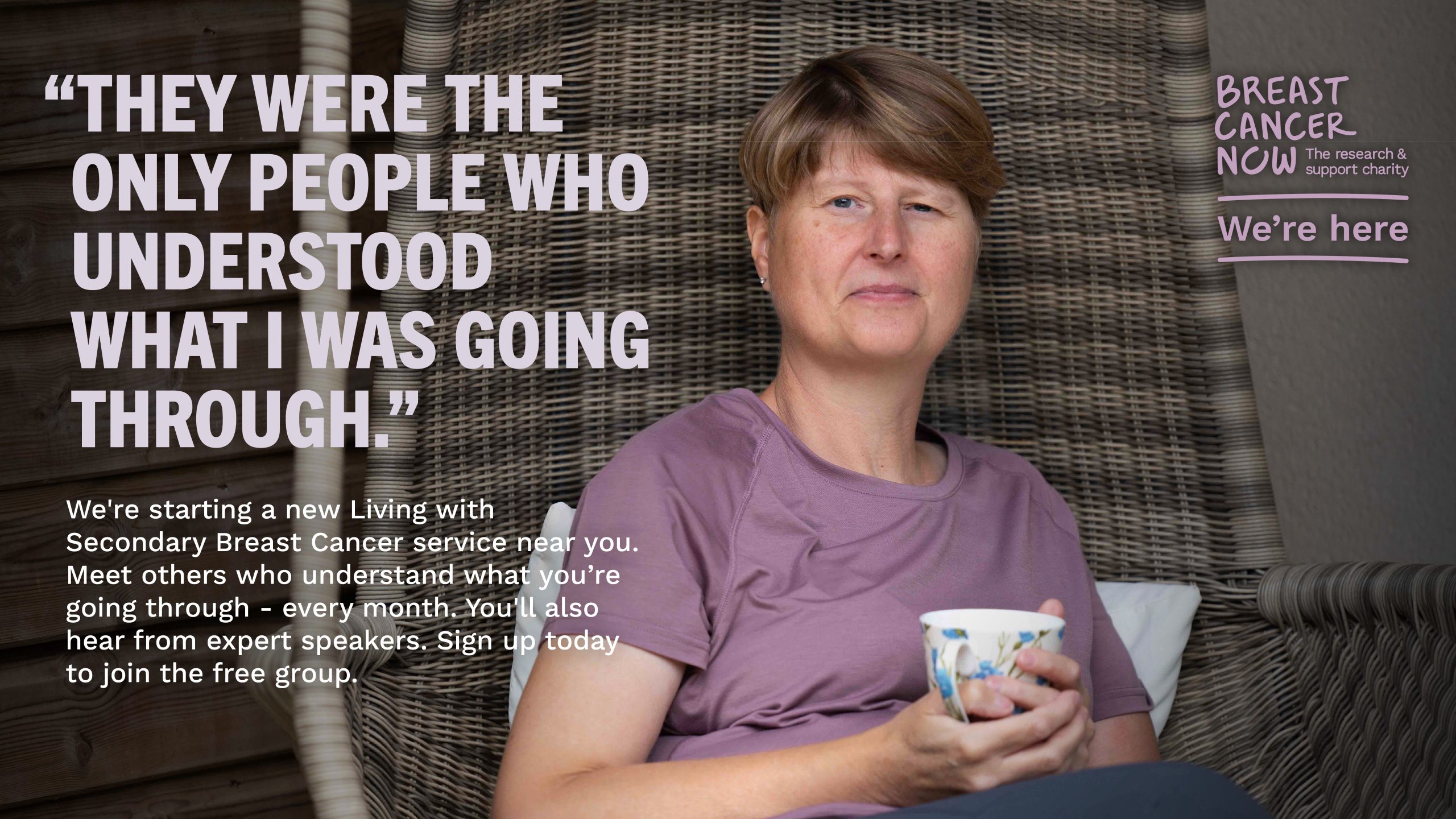 “We know a diagnosis of secondary breast cancer can mean adjusting to difficult changes in your life, and sometimes it can help to talk with other people in a similar situation. Our free Living with Secondary Breast Cancer group in Liverpool gives you the chance to do just that, in a relaxed and supportive environment.”